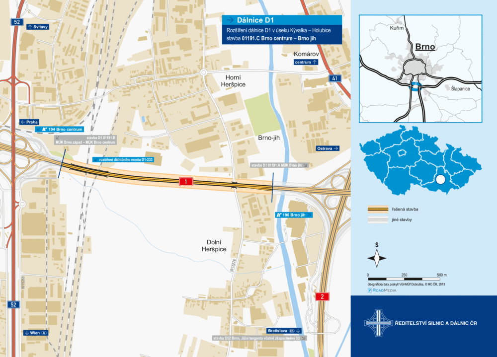 Ředitelství silnic a dálnic dnes zahajuje rozšiřování prvního úseku dálnice D1 u Brna na šestipruhové uspořádání. Konkrétně se jedná o úsek Brno-centrum (EXIT 194) – Brno-jih (EXIT 196).