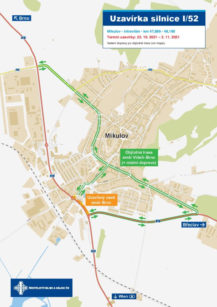 Opravu průtahu Mikulovem zahájíme v sobotu 23. 10. Pracovat budeme v úseku od okružní křižovatky u nákupního centra Billa až po křižovatku silnic I/52 a I/40. Práce nelze realizovat za plného provozu a neobejdou se tedy bez dopravního omezení.