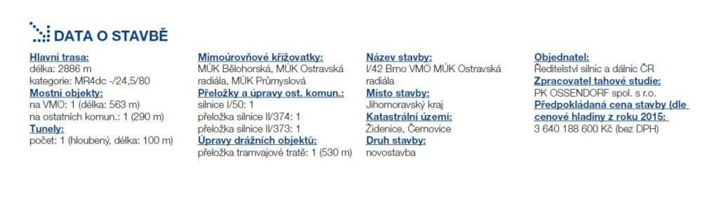 Stavba I/42 Brno VMO MÚK Ostravská radiála tvoří ve výhledovém systému provozu v Brně klíčovou úlohu, stejně jako jiné křižovatky spojující radiály a Velký městský okruh. Také tento uzel zabezpečí napojení území či městských částí na vyšší komunikační systém, nebo následné propojení do centrálních oblastí města. Umožní plynulý provoz k D1 směr Ostrava a opačným směrem na Svitavy. Odvedením dopravy na Velký městský okruh se výrazně zlepší doprava v dnes exponovaných částech Brna. Kromě snížené nehodovosti a zvýšení bezpečnosti provozu dojde ke zvýšení plynulosti dopravy s příznivým dopadem na životní prostředí.