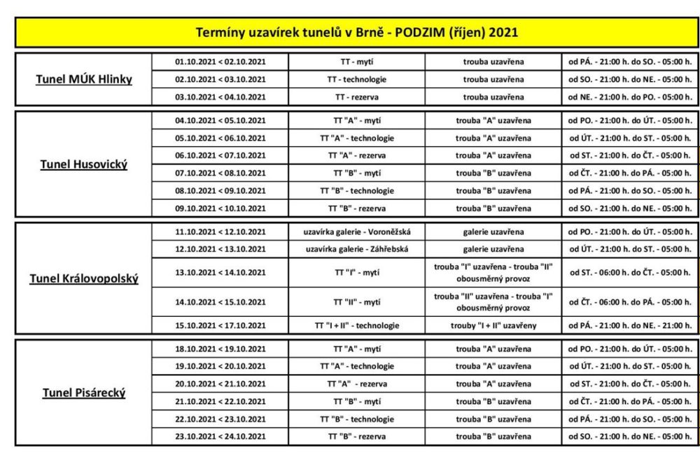 Dnes ráno jsme dokončili údržbu v tunelu MÚK Hlinky a ve 21:00 se přesuneme do Husovického tunelu. Údržbové práce zde budou probíhat do 9. 10., vždy v nočních hodinách mezi 5:00 – 21:00.