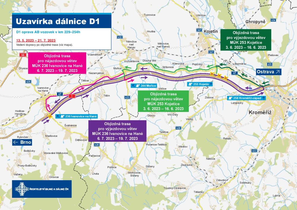 V průběhu června se vzhledem k posunu prací do další etapy opět změní vedení provozu. Od začátku června bude uzavřena nájezdová a sjezdová větev EXITu 253 Kojetín a provoz bude veden po objízdných trasách viz mapka. Dokončení prací plánujeme v červenci.