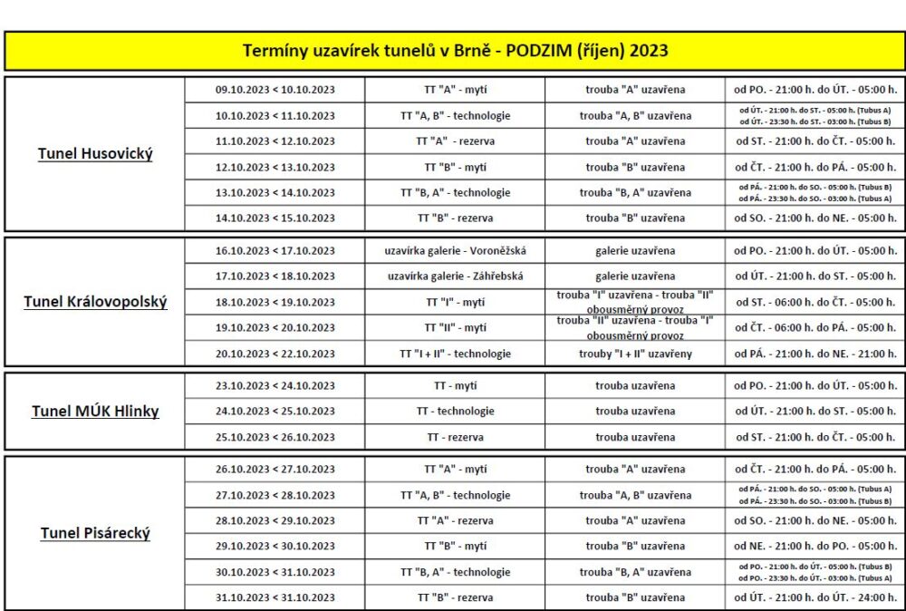 Následovat bude podzimní údržba v tunelech MÚK Hlinky a Pisáreckém. Zde již nebude nutná denní uzavírka, ale budeme pracovat pouze v nočních hodinách v době od 21:00 do 5:00.