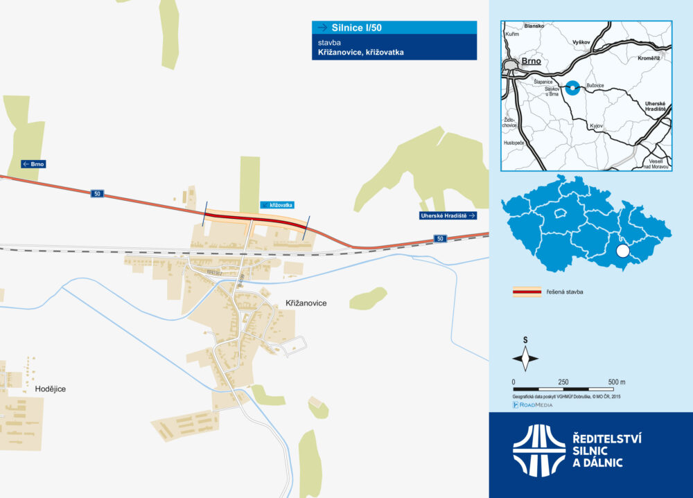 Upozorňujeme řidiče, že od úterního rána 3. června začne platit úplná uzavírka silnice I/50 v Křižanovicích pro vozidla do 3,5 t. Objízdná trasa povede přes Slavkov u Brna, Nížkovice, Žarošice, Ždánice a po silnici II/431 do Bučovic. Vozidla nad 3,5 t projedou stavbou kyvadlově na semafory. Důvodem omezení je zahájení přestavby křižovatky silnic I/50 a III/4199. Hotovo chceme mít do konce srpna.