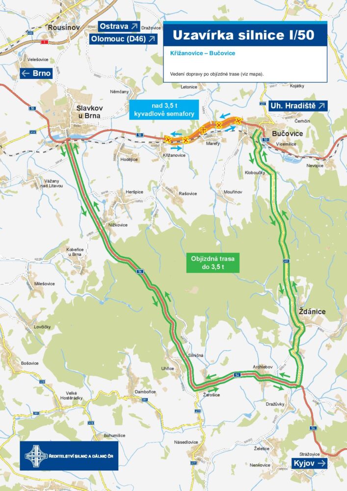 V podělí 27. 5. začneme opravovat silnici I/50 v úseku Křižanovice – Bučovice. Práce jsou plánovány na 24 dnů. Osobní auta budou jezdit po objízdná trase: I/54 Slavkov u Brna, Žarošice, Archlebov a po II/431 do Bučovic. Vozidla nad 3,5t, autobusy a IZS projedou vždy kyvadlově po polovině opravované silnice. Oprava vyjde na 38,46 mil. Kč bez DPH.