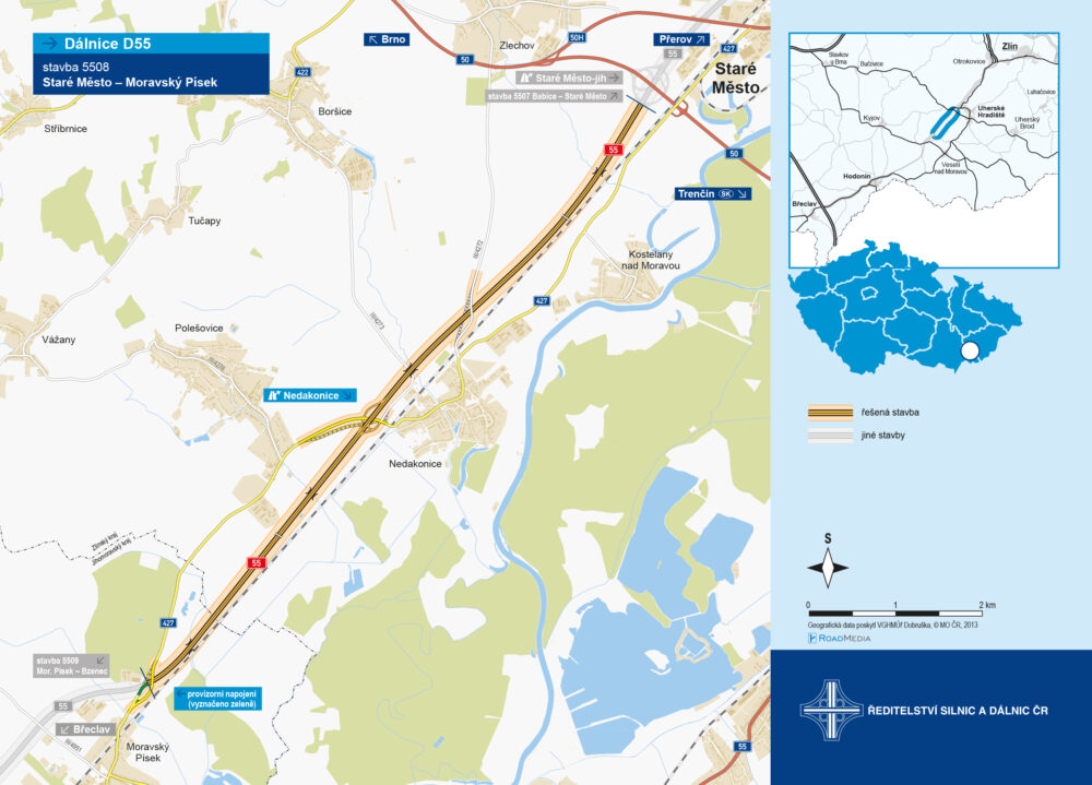 Po krátké zimní přestávce se práce na stavbě dálnice D55 5508 Staré Město – Moravský Písek v únoru znovu naplno rozběhly. Opět přinášíme pohled z ptačí perspektivy, jak aktuálně vypadá trasa budovaného dálničního úseku, jehož zprovoznění předpokládáme v roce 2024.