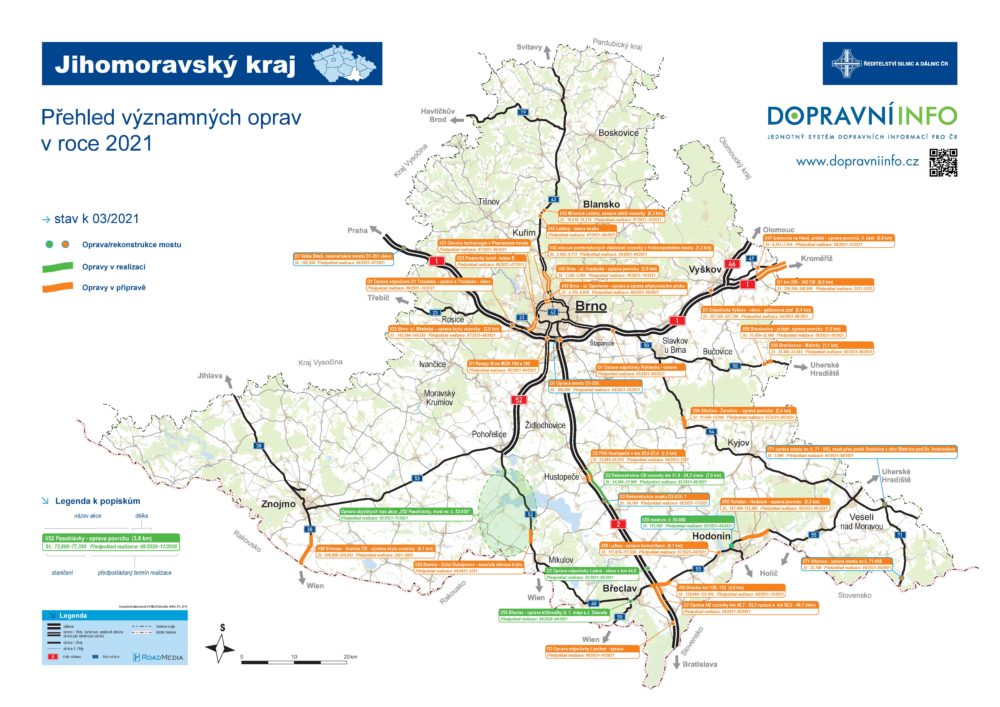 Sezona oprav se v JM kraji začíná rozbíhat. Již jsme se pustili do rekonstrukce povrchu dálnice D2 v km 31,9-24,3, oprav objízdných tras v okolí VN Nové Mlýny, odpočívky Ladná na D2 a chystáme dalších 32 projektů. O jejich zahájení a dopravních omezeních budeme řidiče včas informovat.