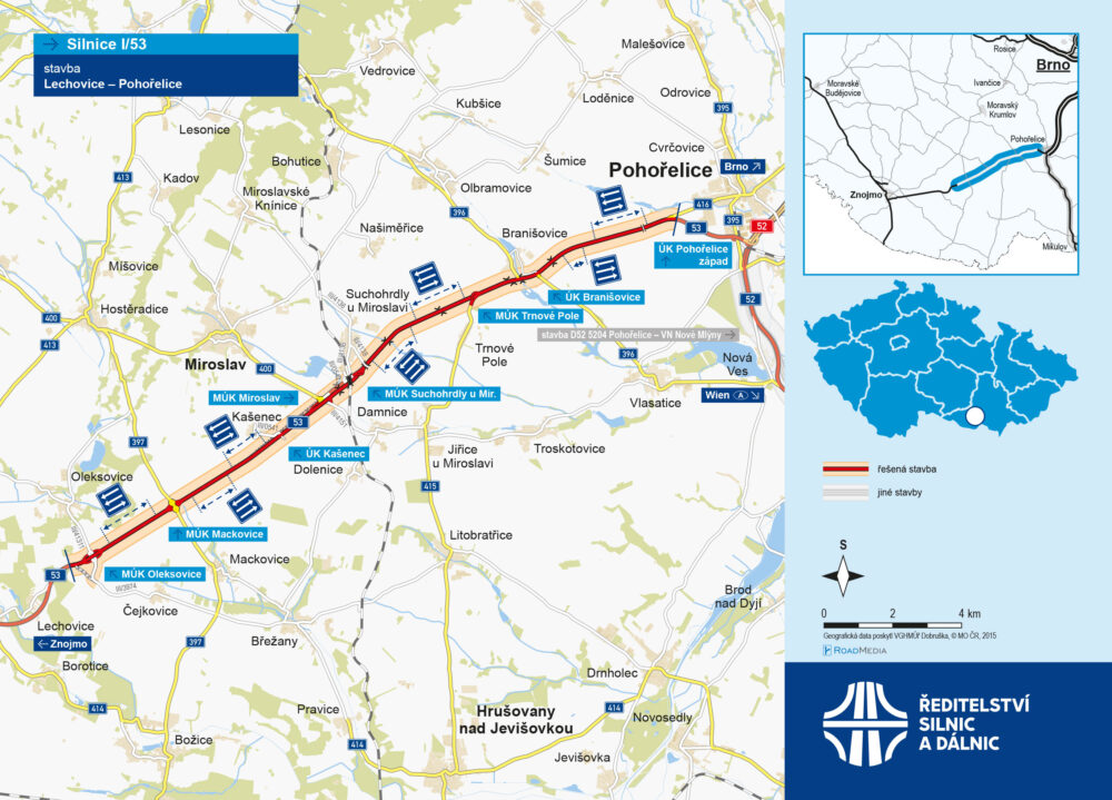 Zahájili jsme výběrové řízení na zhotovitele stavby “I/53 Lechovice – Pohořelice”. Předpokládaná hodnota zakázky na realizaci přeložky silnice I/53 v délce 20,6 km v uspořádání 2+1 je 3,3 miliard korun bez DPH. Na stavbu je vydáno stavební povolení v právní moci a dokončujeme majetkoprávní přípravu.