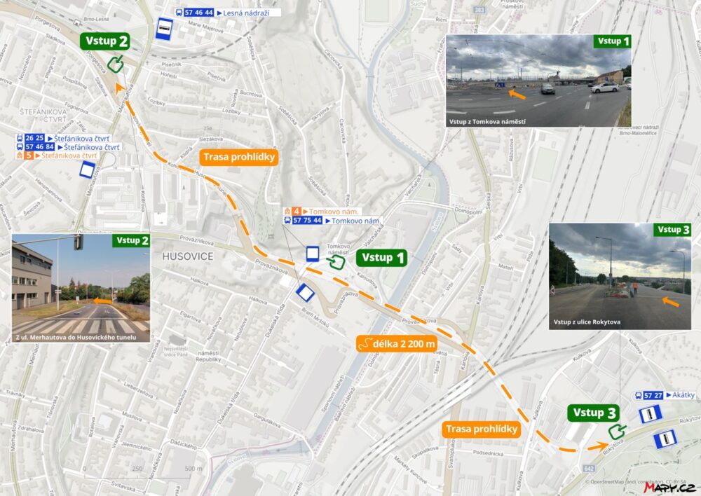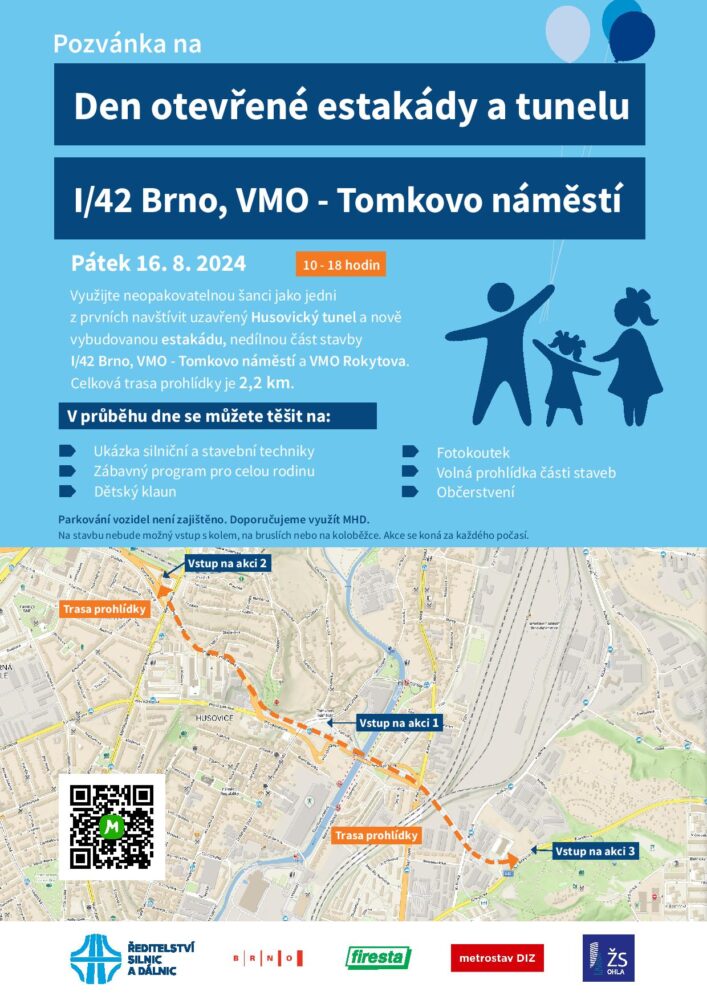Srdečně zveme veřejnost tento pátek 16. srpna do Brna na Den otevřené estakády a Husovického tunelu. Stavba, která je součástí VMO Tomkovo náměstí a VMO Rokytova, bude otevřená od 10:00 do 18:00. Akce nabídne ukázky silniční a stavební techniky, fotokoutek a další zábavný program. Na stavbu bude možné přijít třemi vstupy, které jsou vyznačeny v plánku níže.