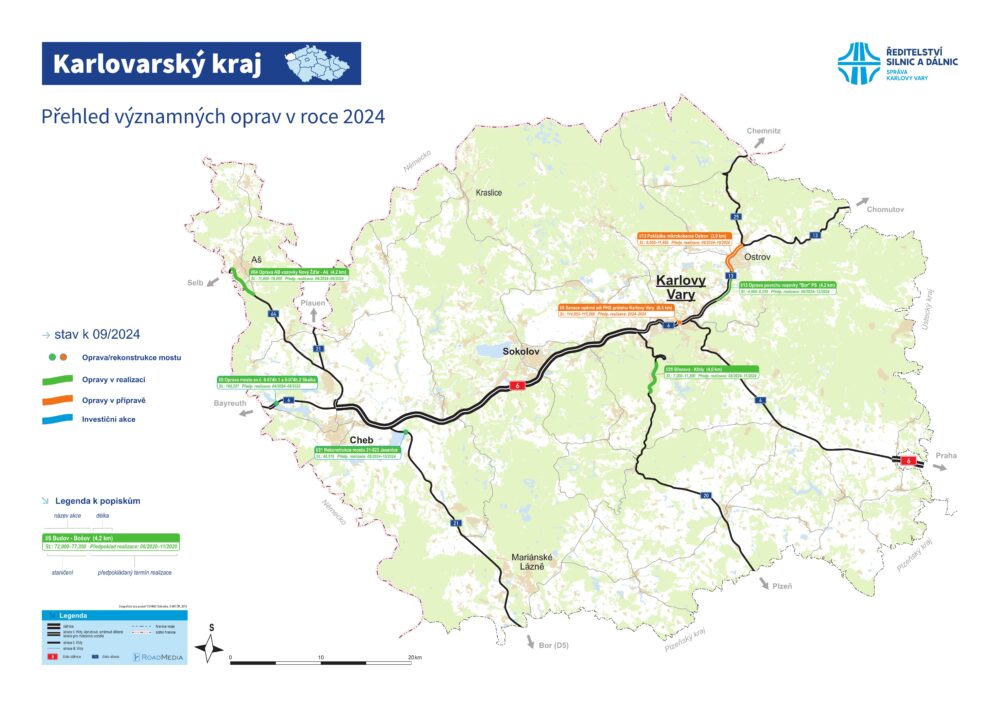 Opět po měsíci přinášíme aktualizovaný přehled významných oprav Karlovarského kraje. Oproti minulému měsíci jsme přidali akci na silnici I/13 mezi Karlovými Vary a Ostrovem, kde proběhne pokládka mikrokoberce. Nyní probíhá 5 velkých oprav a 2 další začneme realizovat během září. Aktuální informace můžete sledovat na síti X.
