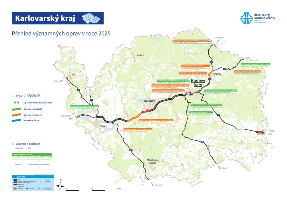 V Karlovarském kraji aktuálně realizujeme 6 velkých oprav. V květnu plánujeme zahájit další 2 akce – opravu mostu u Stráže nad Ohří a na dálnici D6 mezi mimoúrovňovými křižovatkami Tisová a Kamenný Dvůr.