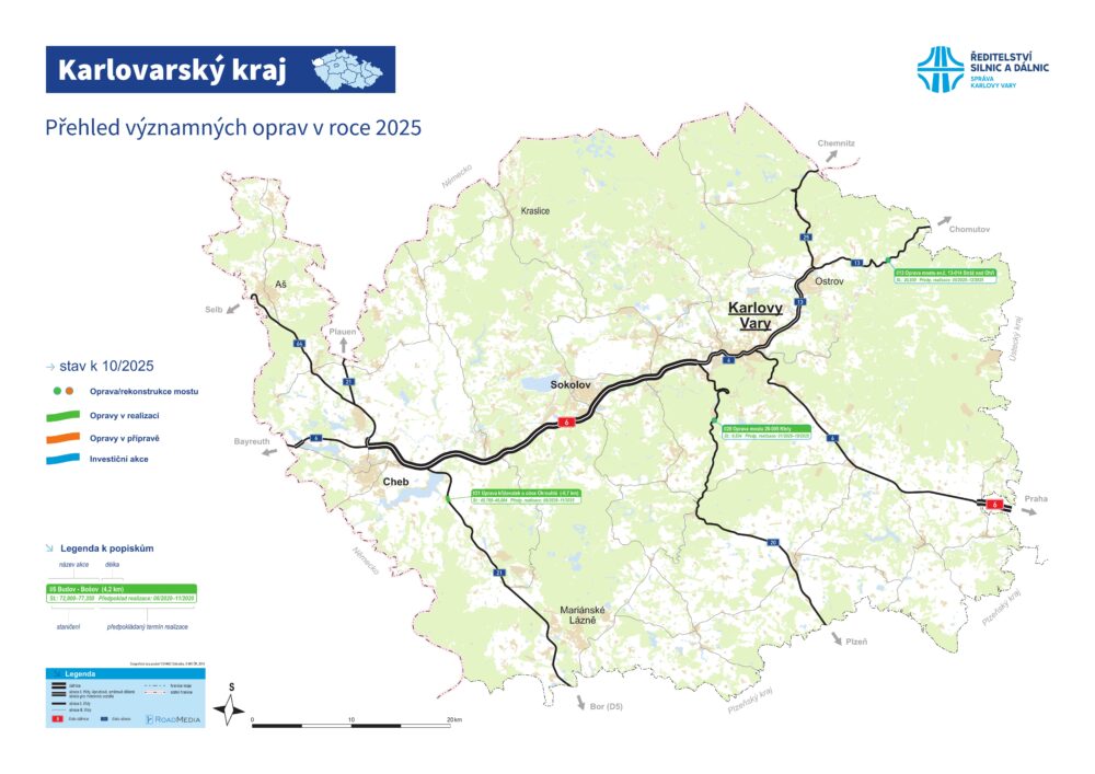 V Karlovarském kraji pokračujeme i v říjnu s opravami na silnicích I. třídy a mostních objektech. Nyní probíhají tři stavební akce, jejichž cílem je zvýšit bezpečnost a komfort dopravy v kraji a prodloužit životnost komunikací.