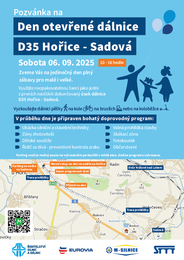 Ředitelství silnic a dálnic zve srdečně širokou veřejnost na Den otevřených dveří dálničního úseku D35 Hořice – Sadová. Akce se uskuteční v sobotu 6. září od 10 do 16h. Využijte neopakovatelnou šanci jako jedni z prvních navštívit dokončovaný úsek dálnice a vyzkoušejte nový asfalt ať už pěšky, na kole nebo na bruslích. Máme pro vás připravený bohatý doprovodný program včetně volné prohlídky části stavby, ukázku dálniční a silniční techniky, fotokoutek, velké pískoviště, občerstvení a pro děti spoustu her a zábavy. Přijďte, těšíme se na Vás.