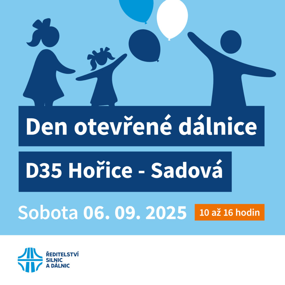 Ředitelství silnic a dálnic zve srdečně širokou veřejnost na Den otevřených dveří dálničního úseku D35 Hořice – Sadová. Akce se uskuteční v sobotu 6. září od 10 do 16h. Využijte neopakovatelnou šanci jako jedni z prvních navštívit dokončovaný úsek dálnice a vyzkoušejte nový asfalt ať už pěšky, na kole nebo na bruslích. Máme pro vás připravený bohatý doprovodný program včetně volné prohlídky části stavby, ukázku dálniční a silniční techniky, fotokoutek, velké pískoviště, občerstvení a pro děti spoustu her a zábavy. Přijďte, těšíme se na Vás.