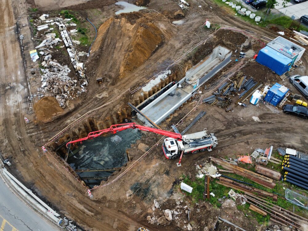 Dále probíhají práce na přeložkách inženýrských sítí. Nově vybudované části vodovodu jsou napojovány na stávající vodovodní řád, což je nezbytné pro zajištění bezproblémového zásobování vodou během celé fáze výstavby i po jejím dokončení.