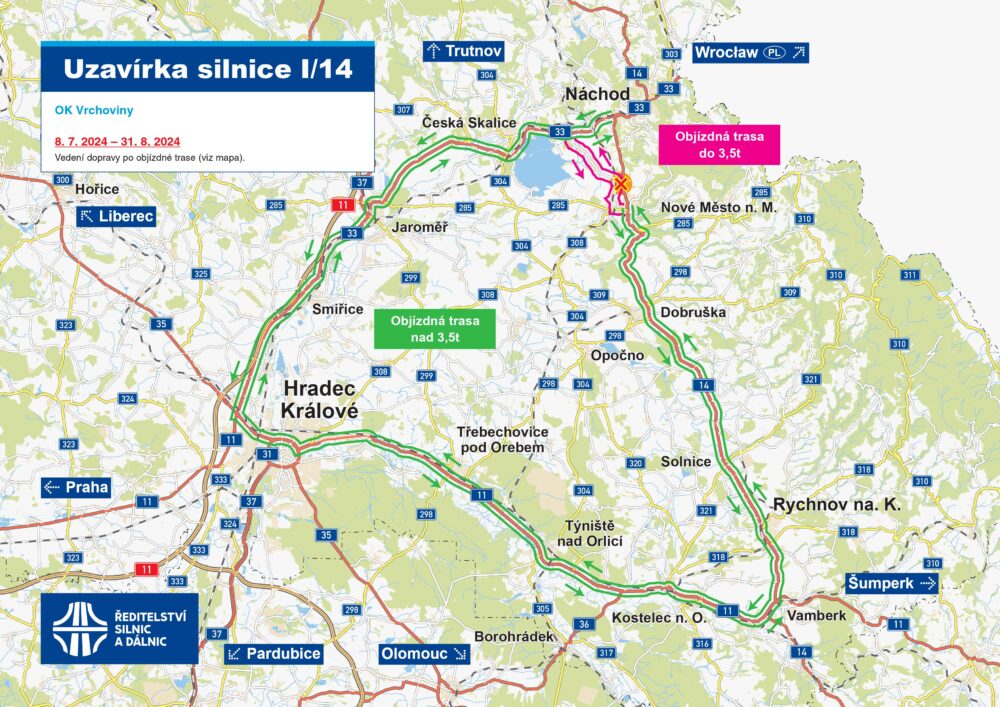 Objízdná trasa pro vozidla nad 3,5 t (obousměrně): I/14 Nové Město n. Metují – I/14 – Vamberk – I/11 – Hradec Králové – I/31 – I/11 – I/31 – Jaroměř – Náchod – zpět na I/14