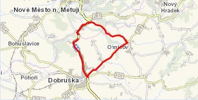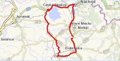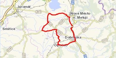 silnice I/14, v katastru obce Dobruška, okr. Rychnov nad Kněžnou, přes: silnice II/298, silnice II/304 (Opočno), Pohoří, Slavětín nad Metují, místní komunikace (Velká Jesenice), silnice I/33 (Česká Skalice), Vysokov, ulice Českoskalická, Náchod, silnice I/14, ulice Dobenínská, Nové Město nad Metují, silnice III/28521: