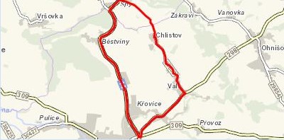 silnice I/14, v katastru obce Dobruška, okr. Rychnov nad Kněžnou, přes: silnice II/298, silnice II/298H (Opočno), silnice II/304, Bohuslavice, místní komunikace, silnice II/308, silnice III/30818 (Slavětín nad Metují), silnice II/304 (Městec), silnice II/285 (ulice Nahořanská) (Krčín):