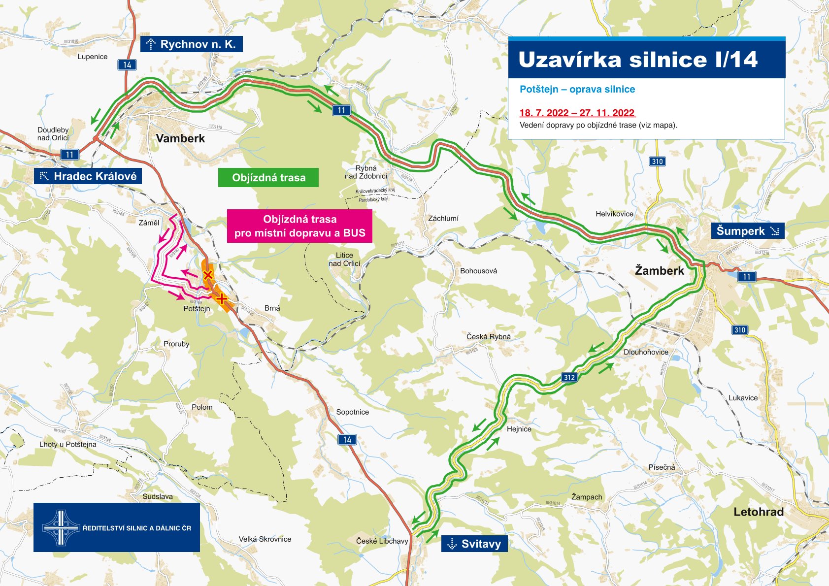 Navržená objízdná trasa je po celou dobu uzavírky vedena po silnici I/11 – Vamberk – Rybná nad Zdobnicí – Helvíkovice – Žamberk, dále po silnici II/312 – Dlouhoňovice – Hejnice – České Libchavy a zpět na silnici I/14. Tato objízdná trasa je navržena obousměrně a bude vedena na území Královéhradeckého a Pardubického kraje.