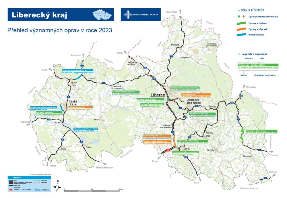 Podívejte se na aktualizovanou mapu s významnými opravami a stavbami, které tento rok v Libereckém kraji realizujeme. Aktuálně probíhají rekonstrukce hned několika mostů, a to například v Jablonci nad Nisou na silnici I/65, v Jablonném v Podještědí na silnici I/13 a v neposlední řadě dvou klíčových mostů v Liberci na silnici I/35. Mezi Novým Borem a Svorem stavíme zkapacitnění silnice I/9 na 3,5 km dlouhém úseku a v Jestřebí probíhá výstavba okružní křižovatky silnic I/9 a I/38, kterou plánujeme pustit do provozu letos na podzim. Dále také rekonstruujeme opěrné zdi mezi Vojtěšicemi a Mladkovem na silnici I/14. Na jakých dalších místem pracujeme nebo plánujeme zahájit stavební práce, se dozvíte zde. V místě stavby je pak třeba počítat s dopravním omezením, kdy řidiče prosíme o trpělivost.