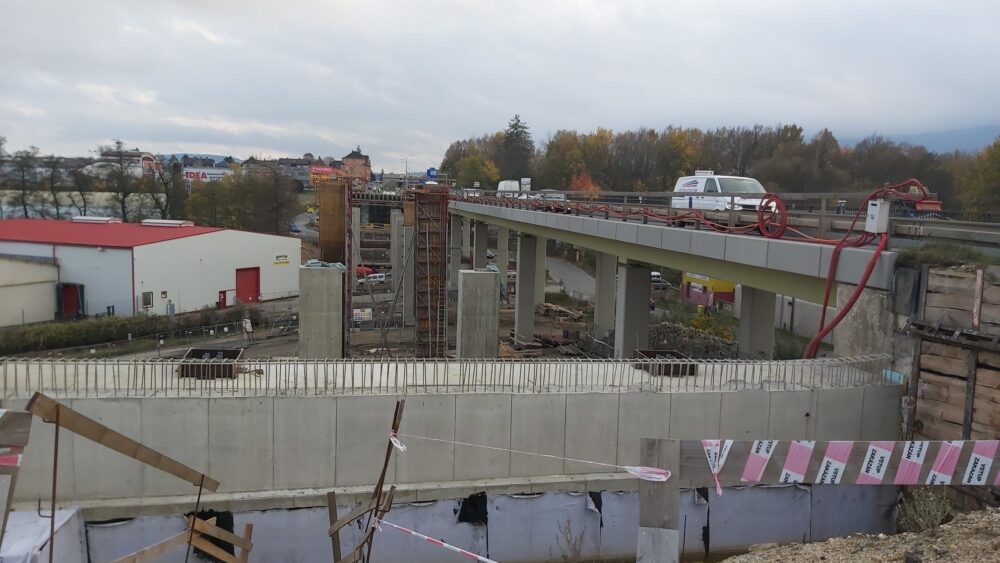 Na prvním mostě ve směru od Prahy (ev. č. 35-024..2) aktuálně probíhá betonáž pilířů, mostovky nad nosníky, aby došlo k jejich zatížení a ke konci měsíce se bude betonovat také mostovka nad příčníky. Na konci listopadu zde budou práce přerušeny z důvodu technologické kázně a daným postupům při montáži předpjatých nosníků a jejich časově omezenému přibetonování.