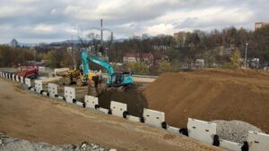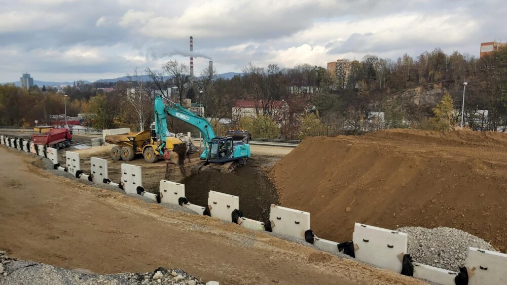 Na druhém mostě (ev. č. 35-022..2) nyní probíhá montáž panelů a realizace zásypu. První část zdi jsme dokončili a druhou část zdi máme rozestavěnou přibližně na 60 %. Armovaný svah plánujeme mít do konce listopadu hotový. Přes zimu se bude armovaný násyp konsolidovat pod přitíženou zeminou, abychom do budoucna předešli dotvarování a s tím spojeným poklesům a poruchám ve vozovce. Během zimní technologické pauzy budou probíhat práce např. na přeložkách, kanalizaci či příprava pro jarní práce.