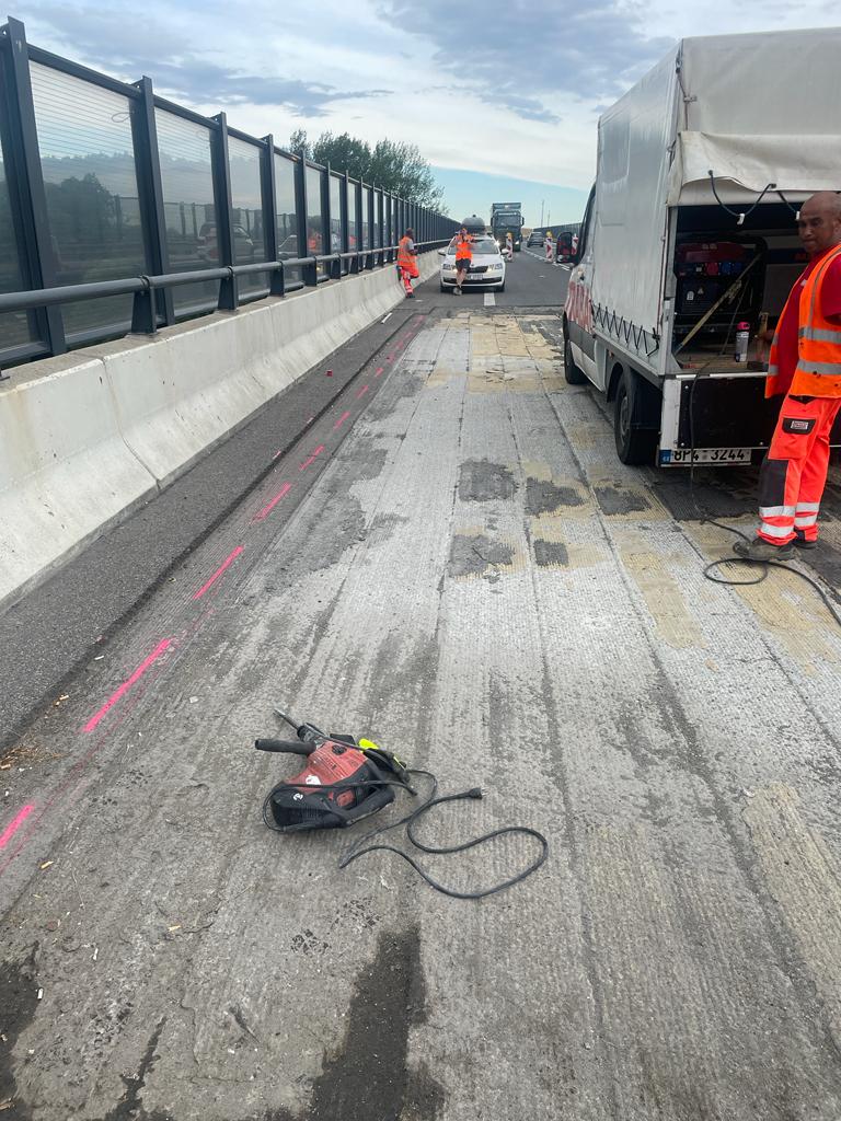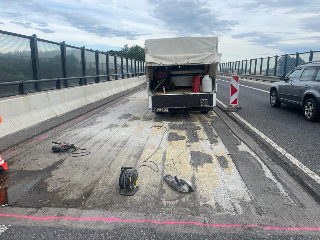 U Grabštejna na silnici I/35 jsme řešili náhlou havárii – poruchu na mostě ev. č. 35-002b přes Václavickou přehradu. Při opravě výtluků v pravém jízdním pruhu ve směru na Chrastavu jsme odhalili trhliny v ochranné vrstvě izolace z litého asfaltu a porušenou vyrovnávku mostovky. Následně jsme zde vyfrézovali obě vrstvy vozovky včetně izolačního pásu z lepenky a na základě provedené diagnostiky jsme zvolili nejvhodnější způsob sanace. Dnes zahajujeme přípravné práce, souvrství navrátíme zpět a předpokládáme, že příští pátek bude úsek opět průjezdný bez omezení. Nyní zde řidiči projedou kyvadlovým provozem řízeným semafory. Děkujeme za trpělivost.