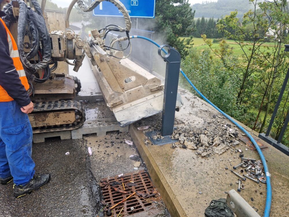 Na mostě u Bílého Kostela n. N. na silnici I/13 aktuálně odstraňujeme železobetonovou konstrukci pomocí vysokotlakého vodního paprsku tzv. hydrodemolici, abychom následně vyndali 2 mostní závěry a nahradili je zcela novými.