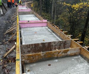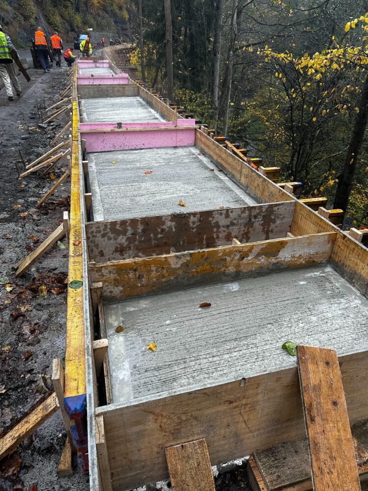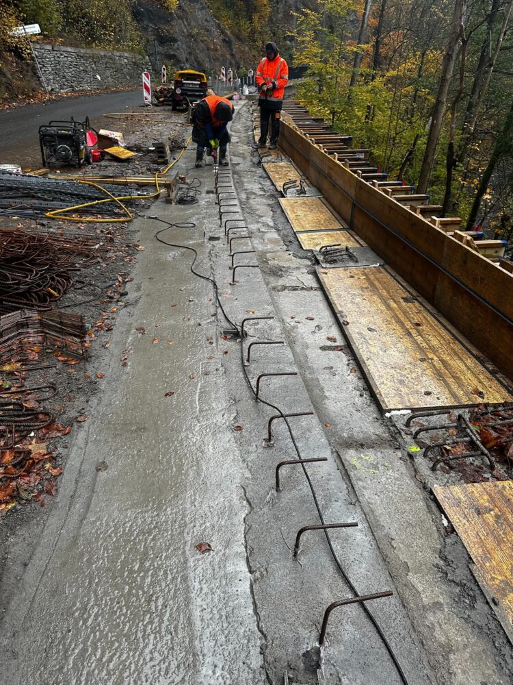 Mezi Vojtěšicemi a Mladkovem na silnici I/14 opravujeme opěrné zdi, na nichž aktuálně betonujeme římsy a osazujeme zábradlí. Na nejdelší zdi jsme minulý týden vybetonovali římsy a nyní osazujeme chrliče do říms a obkládáme zeď kamenem.