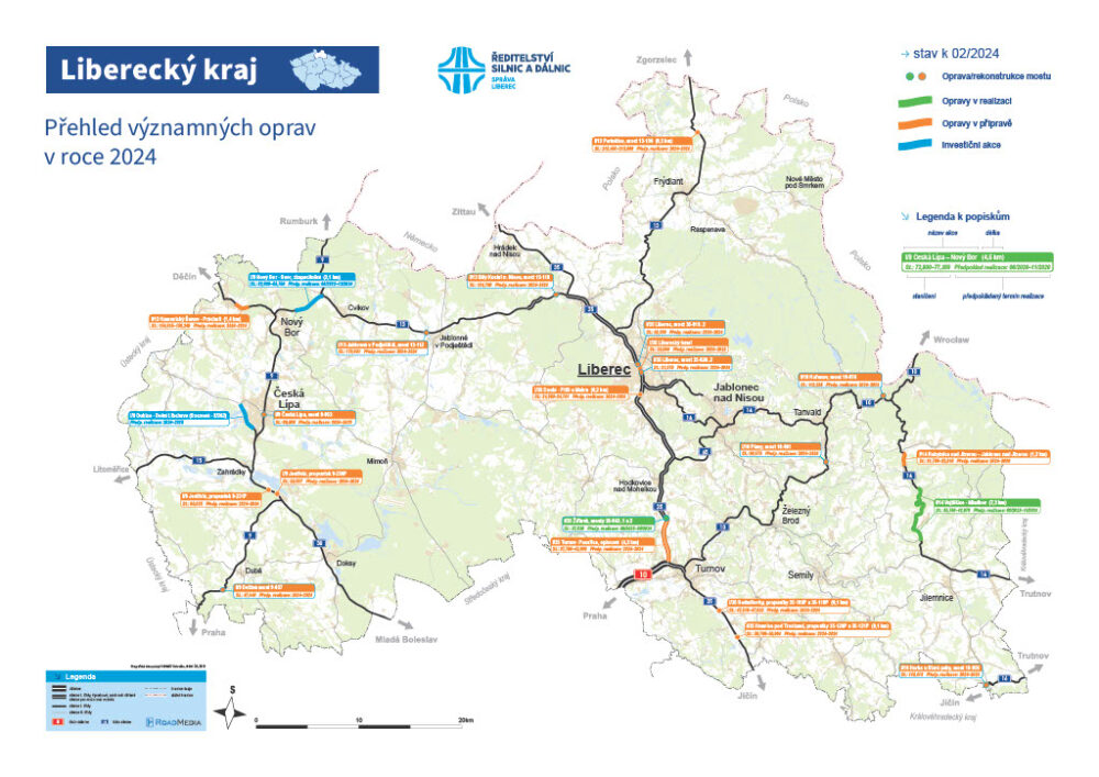 Na Českolipsku máme tři významné akce. Pokračujeme s výstavbou na silnici I/9 mezi obcemi Nový Bor a Svor. 1. 3. 2024 zahajujeme opravu mostu v České Lípě, která by měla trvat do roku 2026. A v neposlední řadě letos začínáme se stavbou obchvatu na silnici I/9 mezi obcemi Dubice – Dolní Libchava, která pomůže zlepšit dopravu v České Lípě.