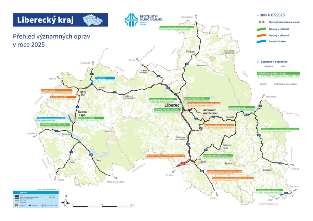 Přehled oprav na silnicích I. tříd během léta najdete v mapě oprav. V Libereckém kraji začneme během července opravovat vozovku v Kamenickém Šenově. V srpnu pak plánujeme opravu mostu u Nového Boru či úpravu okružní křižovatky v Jablonci nad Nisou.