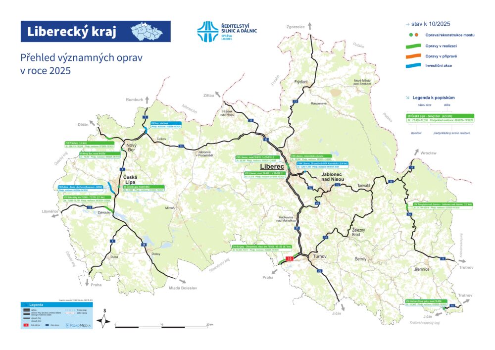 Řidiče čeká pokračování všech významných oprav silnic I. třídy a dálnice D10. Všechny projekty jsou aktuálně v realizaci – od České Lípy přes Liberec až po Turnov. Cílem je zvýšit bezpečnost, plynulost a komfort dopravy v celém kraji.