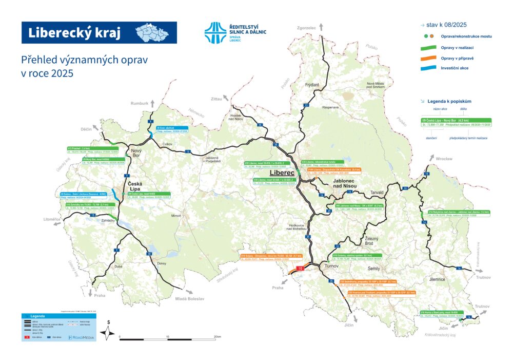 Srpnový přehled významných oprav v Libereckém kraji. Většina akcí je již v realizaci. Začátkem týdne byly zahájeny práce u Nového Boru a v Jablonci nad Nisou. Aktuálně zbývá zahájit poslední čtyři opravy.