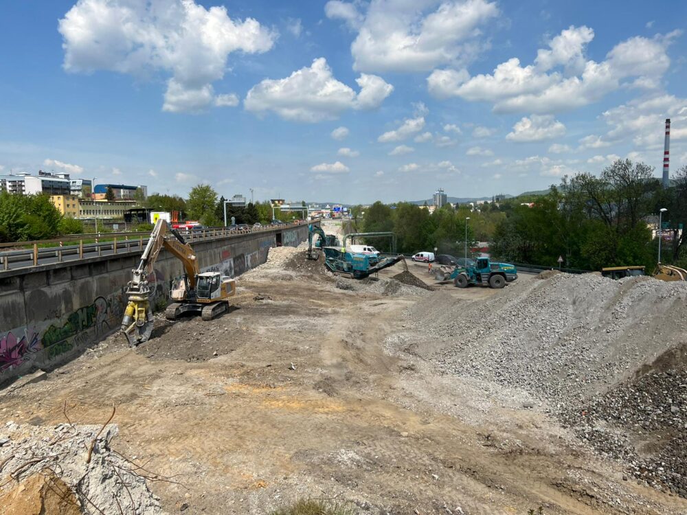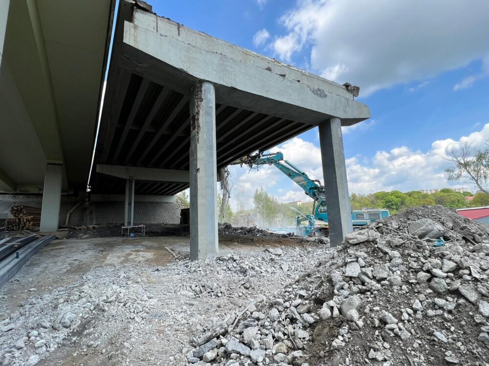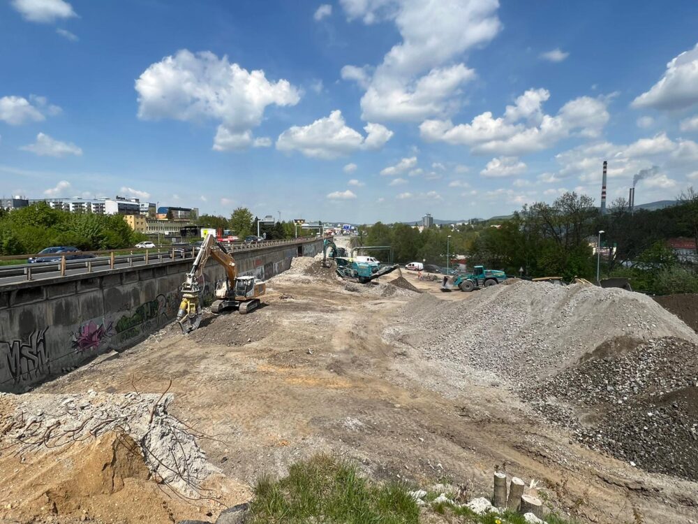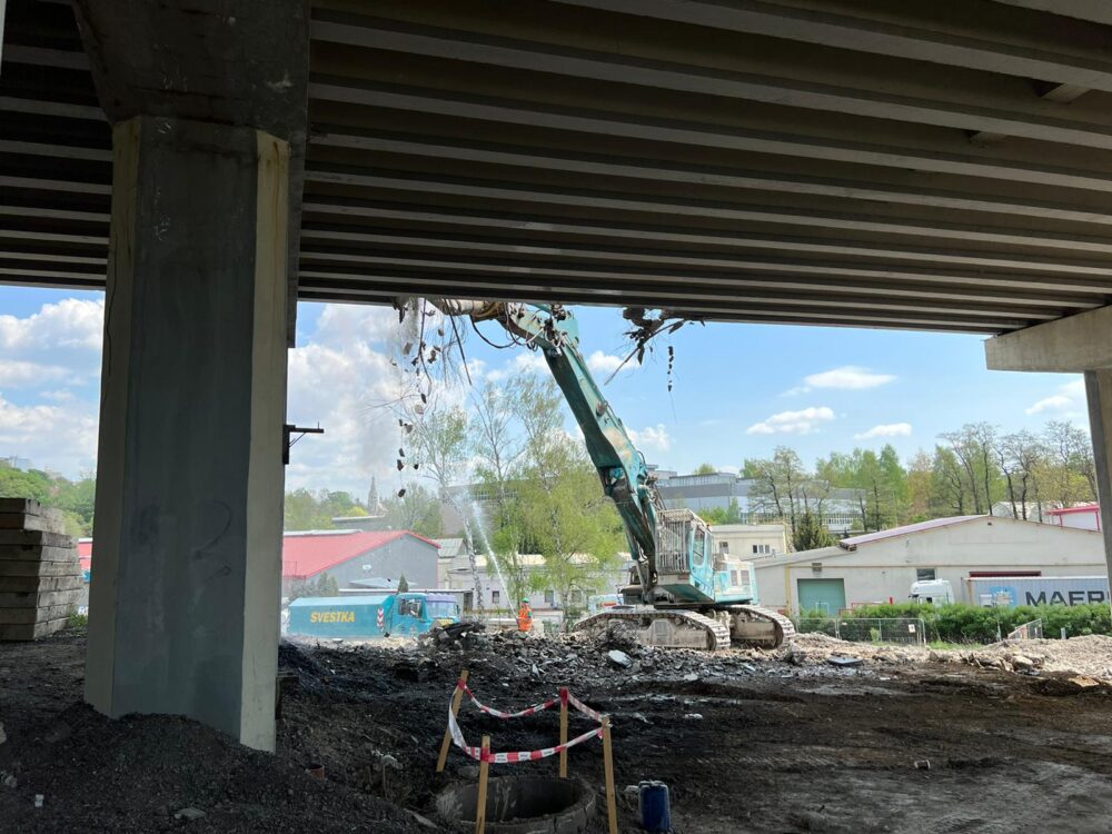 První most (ev. č. 35-024..2) ve směru z Prahy do Liberce je úspěšně zbouraný nad průmyslovým areálem a do konce tohoto týdne zde budou zdemolovány zbylá pole. Druhý most (ev. č. 35-022..2) je kompletně zdemolovaný a probíhá zde úklid a drcení sutě. Zároveň zahájíme přípravy na přeložce teplovodu a založení budoucí opěrné stěny.