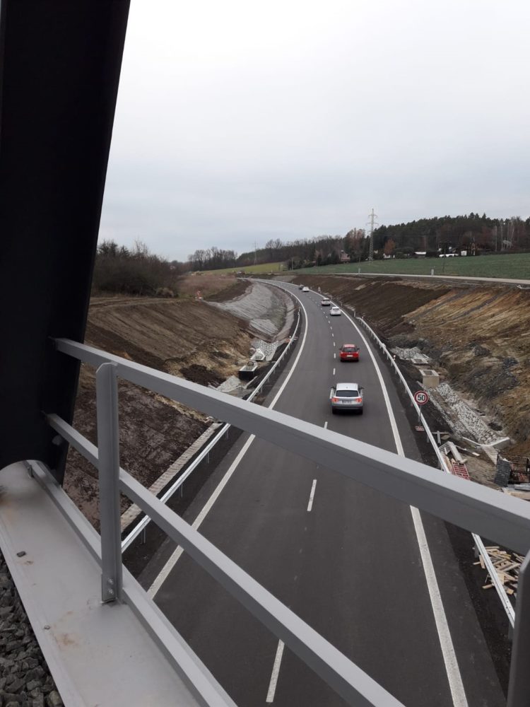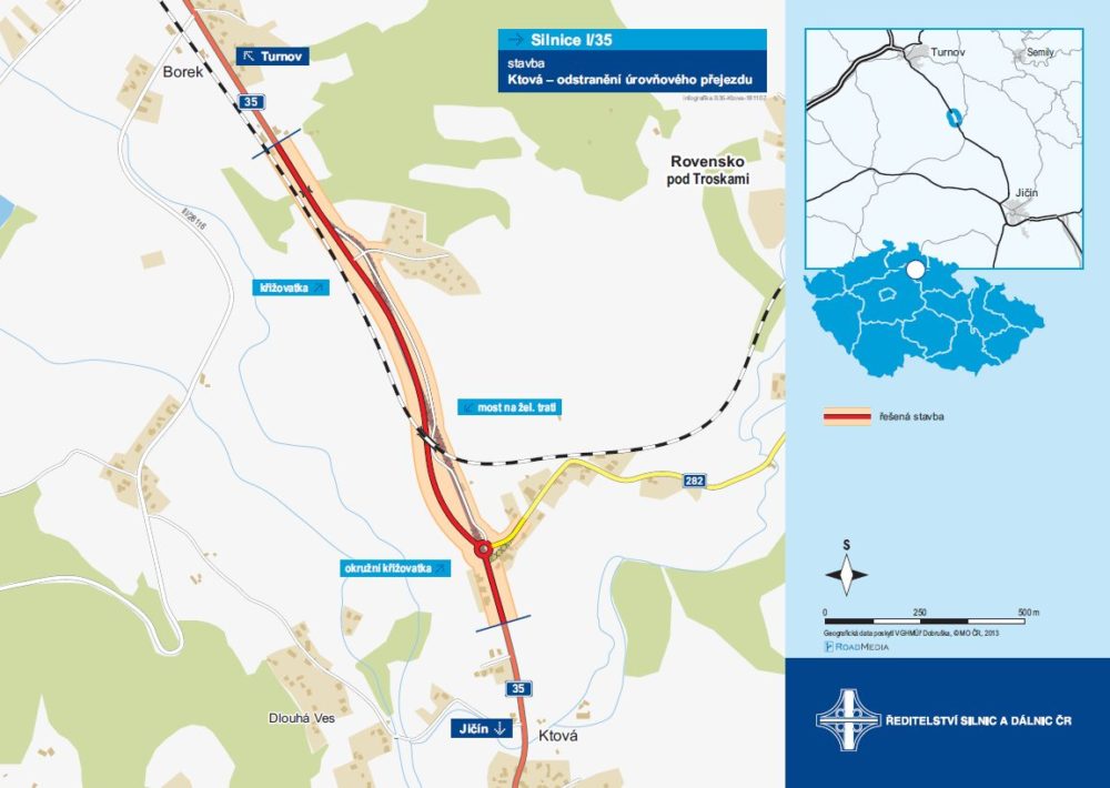 Stavba I/35 Ktová – odstranění úrovňového přejezdu se blíží do finále. Tento nový úsek o délce 1018 metrů pustíme do provozu 27. listopadu 2021, kompletní práce pak ukončíme na jaře 2022. Nyní zde budeme odstraňovat železniční přejezd a přes zimu bude probíhat ohumusování, dokončování příkopů, kanalizace, cyklostezky, veřejného osvětlení, protihlukové stěny, tichého asfaltu na stávající silnici I/35 a další práce. Řidiči nyní místem projedou po nové přeložce kyvadlovým provozem řízeným semafory.