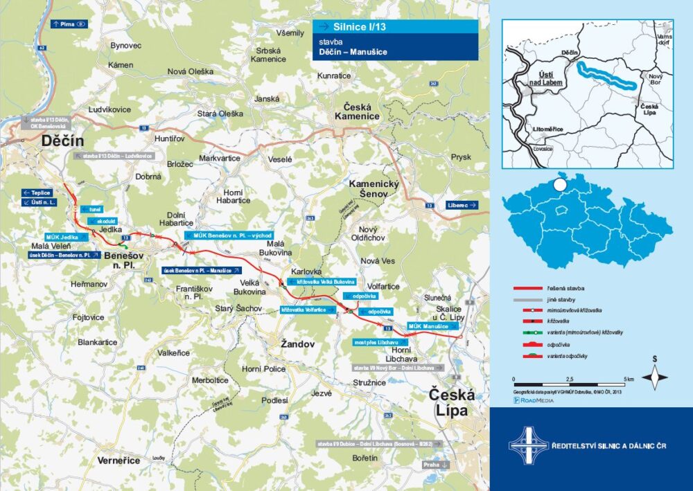 Ke stavbě nového vedení silnice I/13 v úseku Děčín – Manušice jsme předali dokumentaci EIA na Krajský úřad Ústeckého kraje, který rozeslal dokumentaci k připomínkám dotčeným obcím k uveřejnění na úřední desce. Všichni se mohou vyjádřit do 30 dnů od zveřejnění. Následně proběhne dle zákona č. 100 o vlivu stavby na životní prostředí veřejné projednání, zpracování posudku a vydání stanoviska. Ze závěru zjišťovacího řízení došlo ke dvěma úpravám, podvariantám u Jedlky a v lokalitě Velká Bukovina a Volfartice. Zahájení stavby s předpokládanou cenou 3,5 mld. Kč bez DPH plánujeme v roce 2030, uvedení do provozu o pět let později.