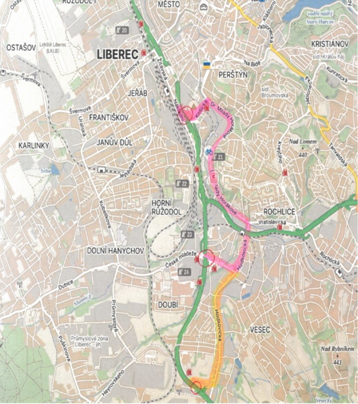 - z ulice České mládeže na ul. Hodkovickou směr ul. Dr. M. Horákové, Košická a nájezdem na I/35 před tunelem