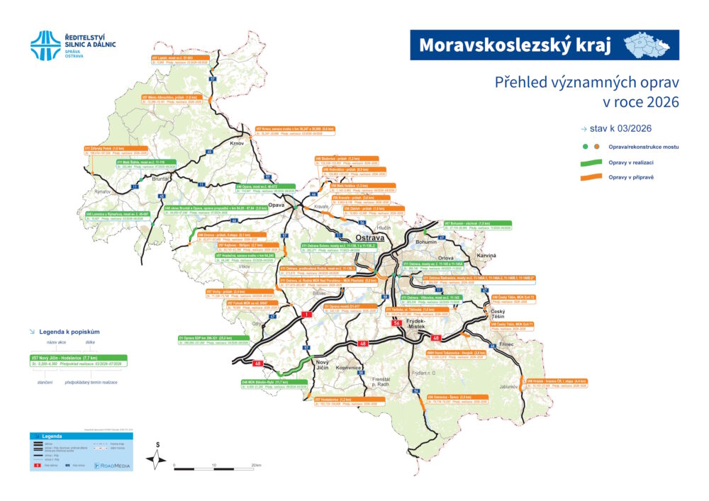 Aktualizovaná mapa oprav pro březen upřesňuje zahájené i plánované rekonstrukce ŘSD v Moravskoslezském kraji. V případě pokročilé fáze příprav uvádíme předpokládané termíny nadcházejících projektů, které zasáhnou do plynulosti dopravy. Kromě barevné mapy poskytujeme podrobné informace také prostřednictvím interaktivní mapové aplikace na oficiálním webu www.rsd.cz.