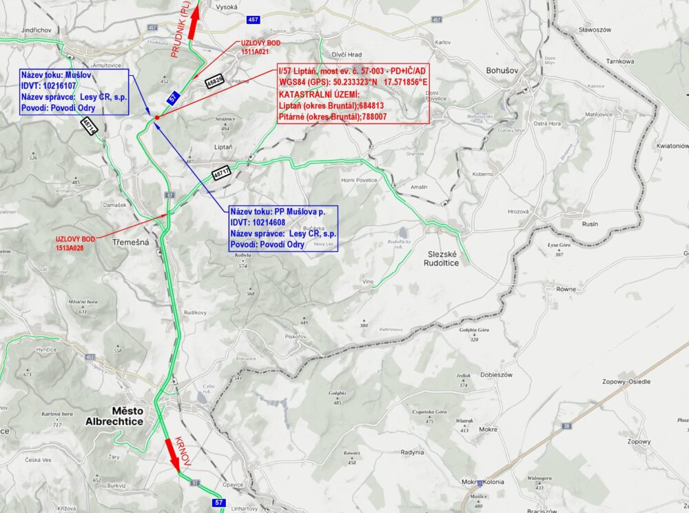 Od pondělí 30. 3. 2026 zahajujeme kompletní rekonstrukci mostu na silnici I/57 v katastru obce Liptaň (most ev. č. 57-003; km 5,867 provozního staničení). Modernizace objektu severně od Krnova je nezbytná pro zajištění další bezpečné provozuschopnosti a prodloužení životnosti konstrukcí.