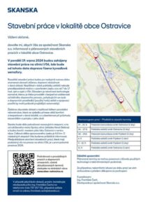 Náročnost opravy ilustrují dopravní změny, které zhotovitel dojednal ve spolupráci s příslušnými institucemi a oslovenými odborníky. V turisticky atraktivní lokalitě Beskyd se bude během opravy jezdit oběma směry kyvadlově kolem semaforů – střídavý režim silnice I/56 přes Ostravici nahradí fáze úplné uzavírky. Zákaz vjezdu vznikne na nejkratší nutné období, konkrétní termíny jsou uvedeny v přiloženém informačním letáku a veškeré aktuality stavby budou včas zveřejněny na stránkách obce https://www.obec-ostravice.cz/.