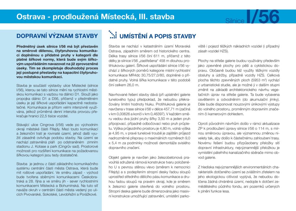 Zajímavé zastřešení silnice I/56 do jednostranně uzavřené galerie sníží dopady husté dopravy, místem projíždí přes 26 500 aut všech kategorií denně (z toho skoro 3 500 těžkých motorových vozidel).