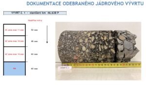 – Jádrové vývrty na místě umožňují odběr stmelených vrstev konstrukce vozovky. Odebrané vzorky putují do laboratoří za účelem posouzení vlastností skutečně použitých materiálů. Vrtání se provádí ve vzdálenosti 25 až 250 délkových metrů podle délky a členitosti posuzovaného úseku.