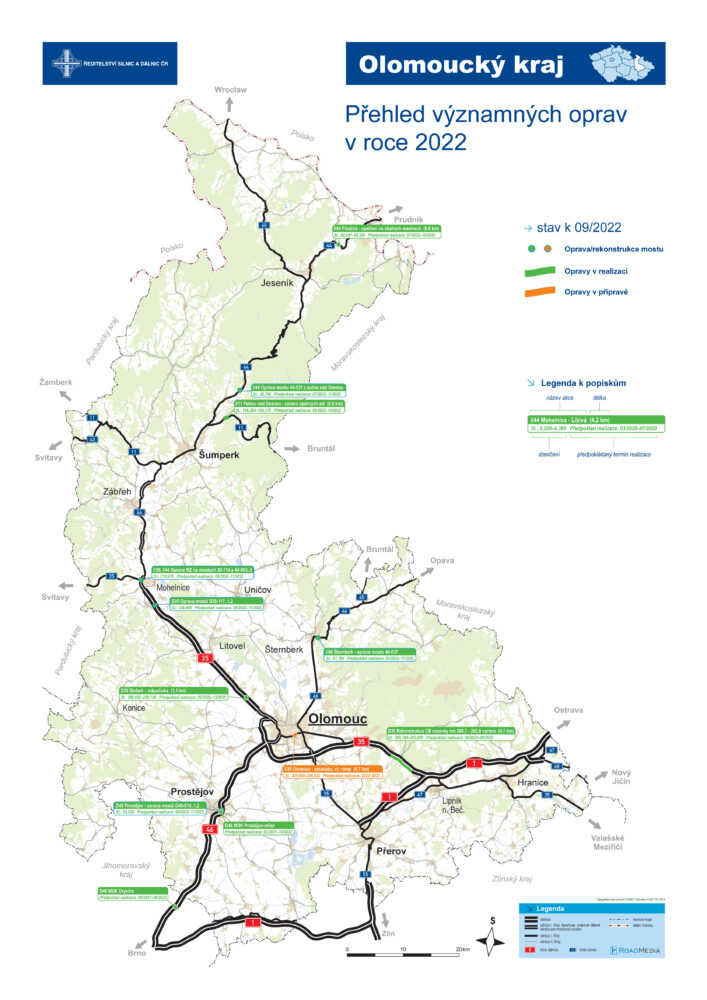 Aktualizované vydání mapy významných oprav ŘSD v Olomouckém kraji. Správa Olomouc zahrnula do letošního plánu i opravu průtahu městem, v případě bezproblémového výběrového řízení a podpisu smlouvy se stavební firmou začnou některé práce na silnici I/35 ještě letos.