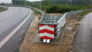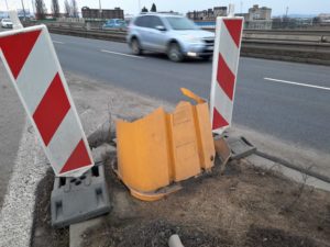 Plastový indikátor nahradí kovový tlumič nárazu doplněný navíc novými svodidly instalovanými na levou stranu výjezdové rampy směr RCO. Součástí montáže moderního tlumiče nárazu bude i provedení železobetonové základové desky pod deformovatelnou konstrukci, proto se oprava za cca 670 000 Kč bez DPH neobejde bez lokálních terénních úprav.