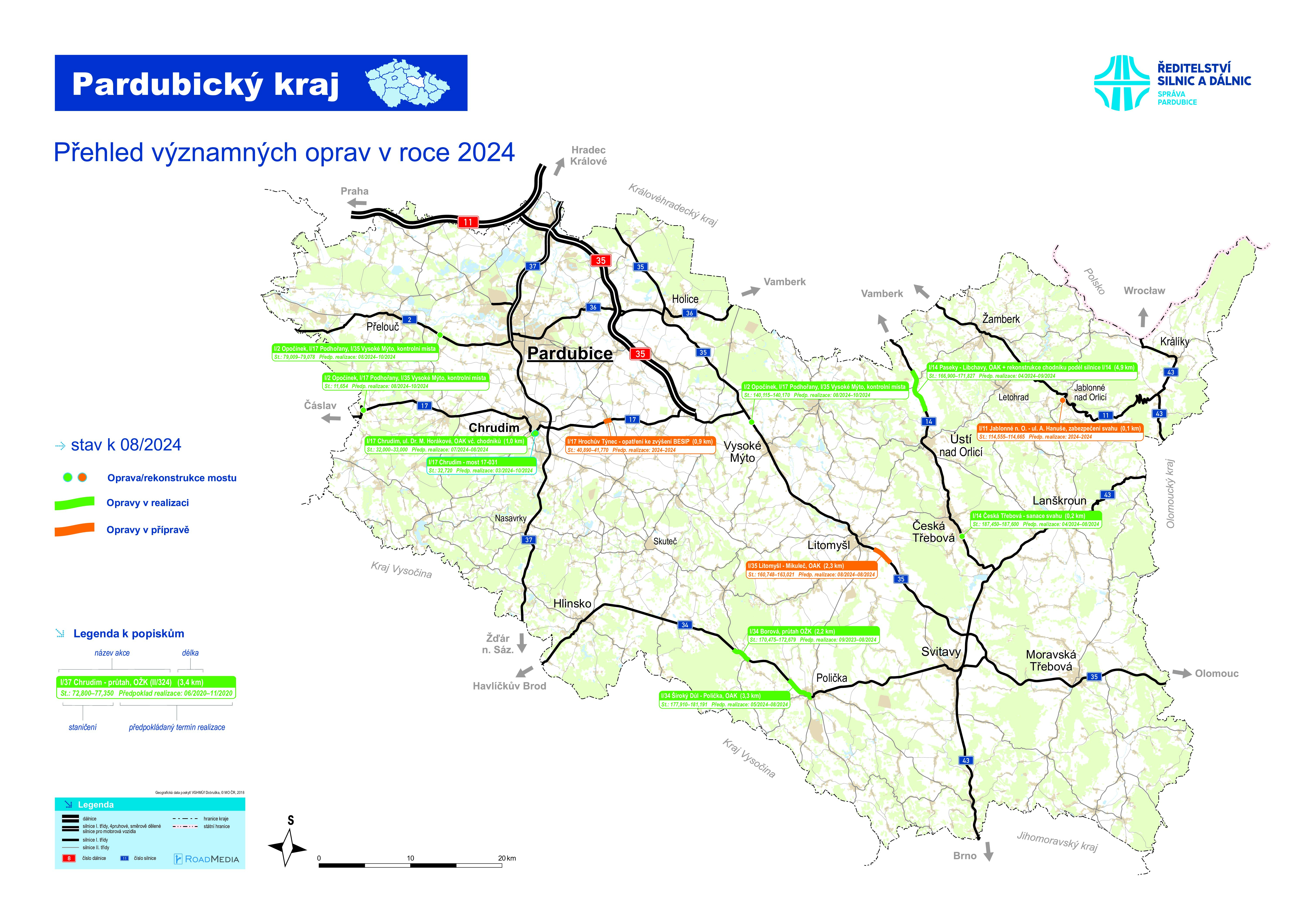 Mapa významných oprav v Pardubickém kraji – srpen 2024