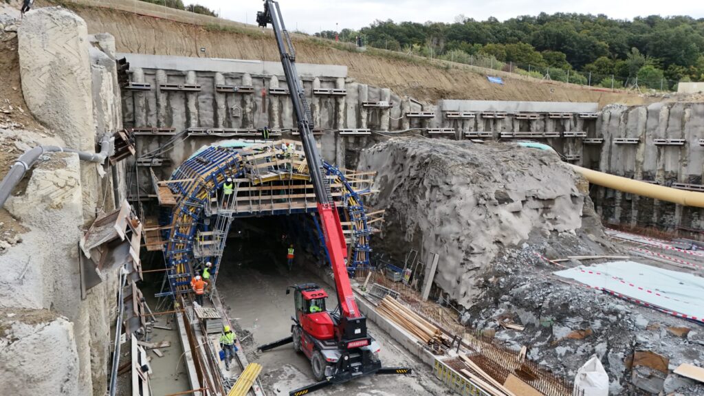 - Východní portál je ve fázi montáže jeklů, probíhá výkop pro tzv. želvu (speciální konstrukční prvek), a následně armování a betonáž dilatačního celku želvy