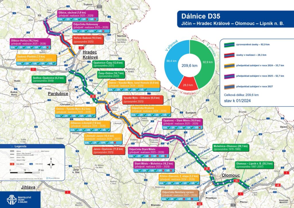 V jaké fázi jsou jednotlivé úseky dálnice D35? Které jsou v realizaci a které zahájíme letos? Podívejte se na aktualizovanou mapu: