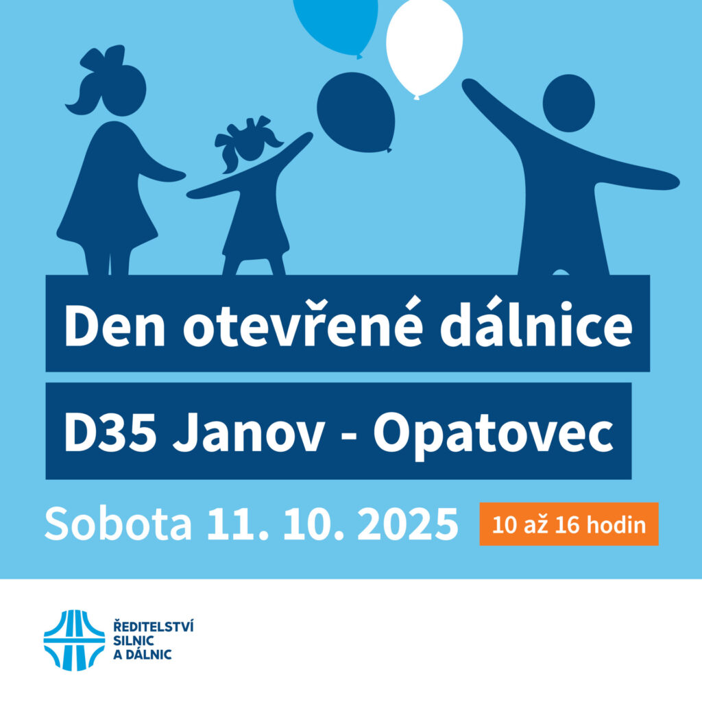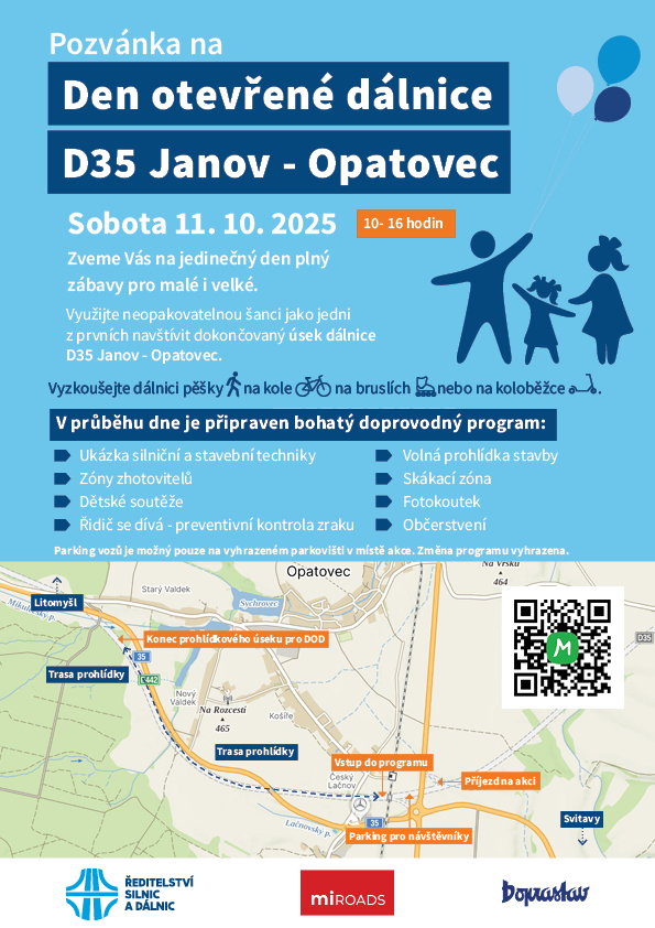 Ředitelství silnic a dálnic zve srdečně širokou veřejnost na Den otevřených dveří dálničního úseku D35 Janov – Opatovec. Akce se uskuteční v sobotu 11. října od 10 do 16h. Využijte neopakovatelnou šanci jako jedni z prvních navštívit dokončovaný úsek dálnice a vyzkoušejte 3 km nového asfaltu ať už pěšky, na kole nebo na bruslích. Máme pro vás připravený bohatý doprovodný program včetně volné prohlídky části stavby, ukázku dálniční a silniční techniky, fotokoutek, velké pískoviště, občerstvení a pro děti spoustu her a zábavy. Přijďte, těšíme se na Vás.