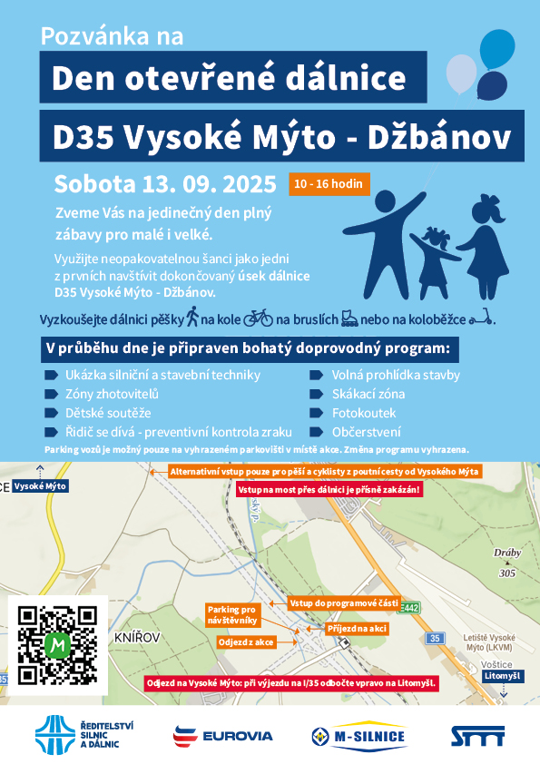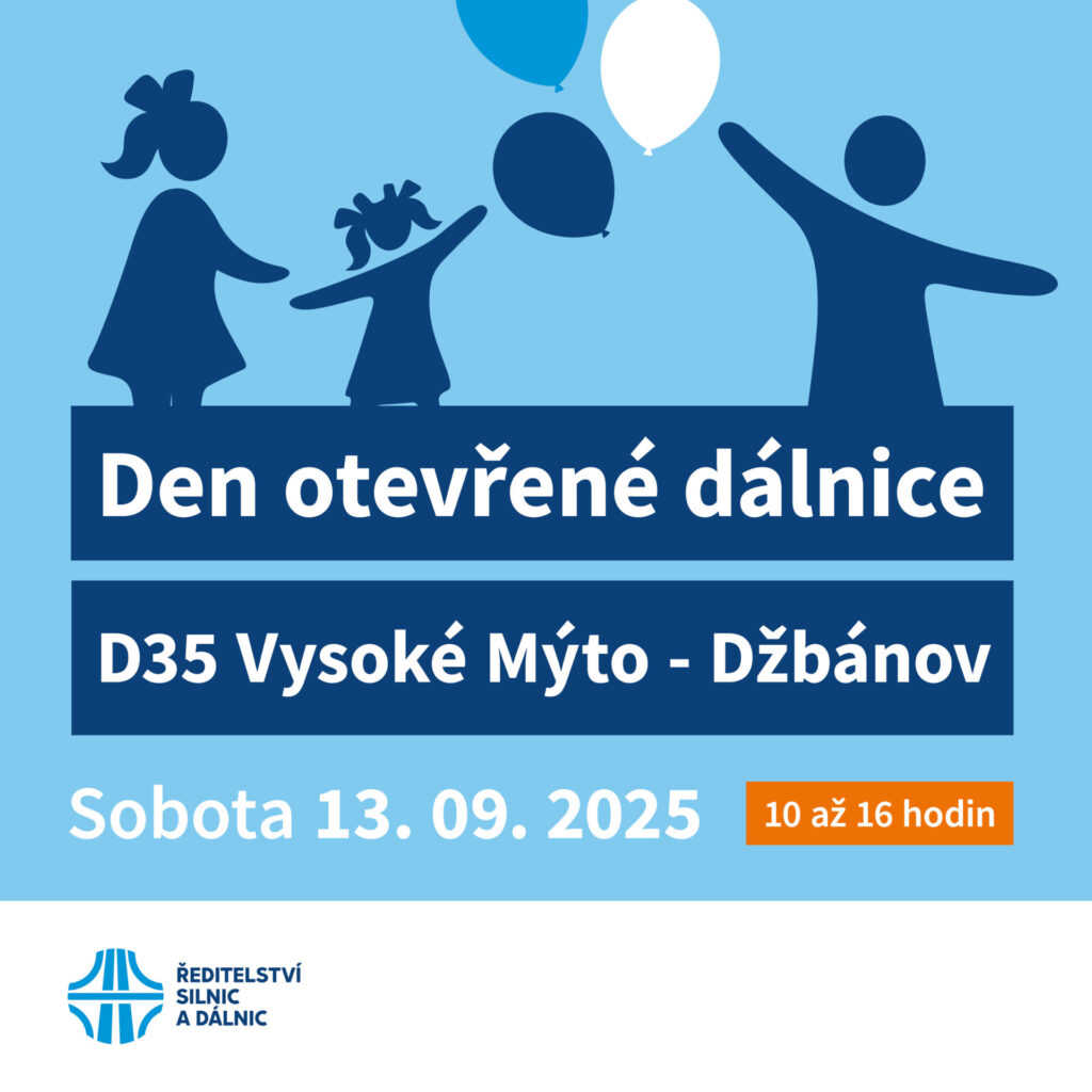 Ředitelství silnic a dálnic zve srdečně širokou veřejnost na Den otevřených dveří dálničního úseku D35 Vysoké Mýto – Džbánov. Akce se uskuteční v sobotu 13. září od 10 do 16h. Využijte neopakovatelnou šanci jako jedni z prvních navštívit dokončovaný úsek dálnice a vyzkoušejte nový asfalt ať už pěšky, na kole nebo na bruslích. Máme pro vás připravený bohatý doprovodný program včetně volné prohlídky části stavby, ukázku dálniční a silniční techniky, fotokoutek, velké pískoviště, občerstvení a pro děti spoustu her a zábavy. Přijďte, těšíme se na Vás.
