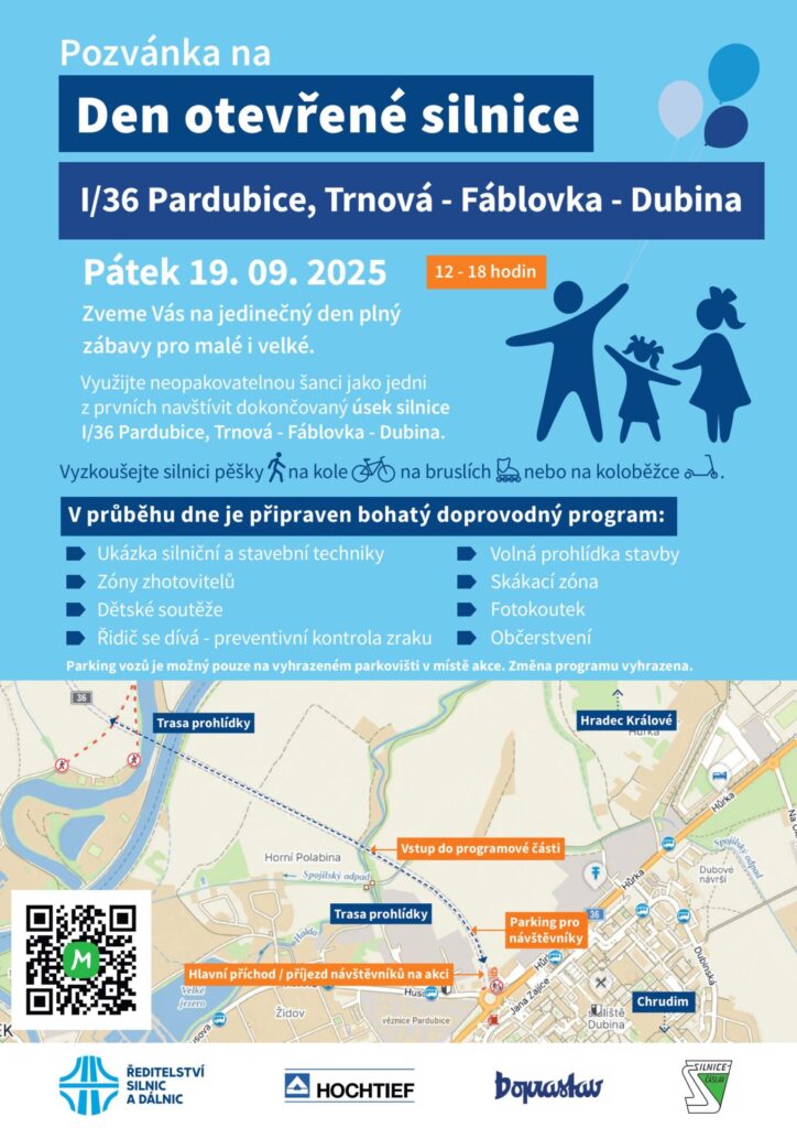 Ředitelství silnic a dálnic zve srdečně širokou veřejnost na Den otevřené silnice na I/36 Severovýchodním obchvatu Pardubic. Akce se uskuteční v pátek 19. září od 12 do 18h. Využijte neopakovatelnou šanci jako jedni z prvních navštívit dokončovaný obchvat a vyzkoušejte nový asfalt ať už pěšky, na kole nebo na bruslích. Máme pro vás připravený bohatý doprovodný program včetně volné prohlídky části stavby, ukázku dálniční a silniční techniky, fotokoutek, velké pískoviště, občerstvení a pro děti spoustu her a zábavy. Přijďte, těšíme se na Vás.