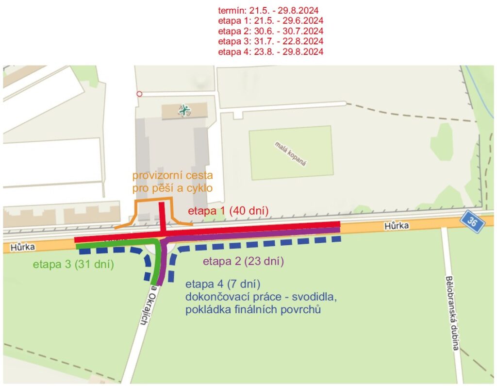 Stavba bude probíhat ve čtyřech etapách a po celou dobu výstavby bude doprava vedena kyvadlově – přes den pracovníky stavby, mimo pracovní dobu – světelnou signalizací. Stávající cyklostezka vedoucí podél I/36 bude uzavřena, vybudována bude provizorní cesta pro cyklisty a pěší. I pro autobusovou zastávku ve Spojile je značena náhradní obchozí trasa – více v mapce níže.